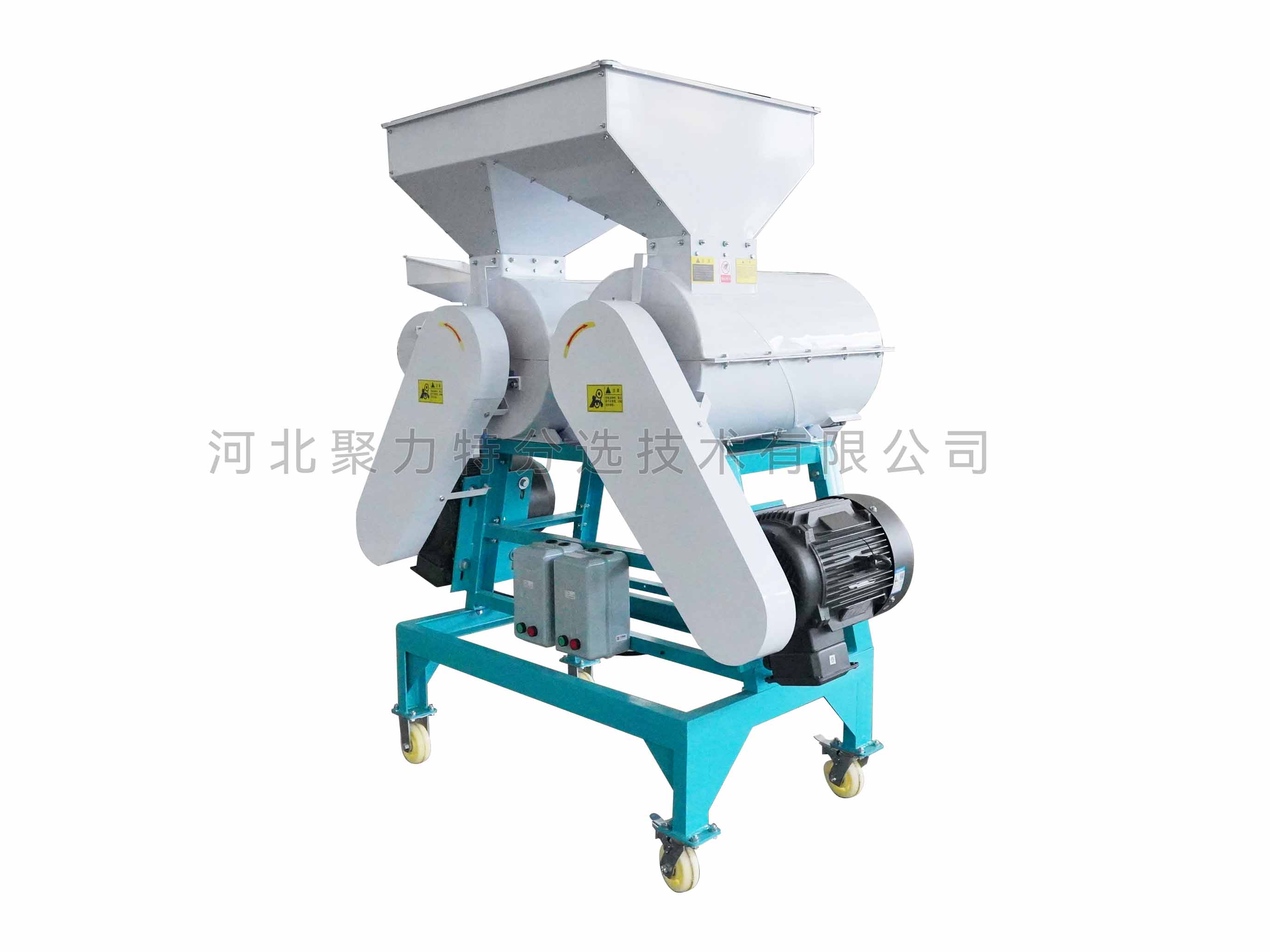 該機(jī)是以柔性碾搓為主,通過合理的轉(zhuǎn)速設(shè)計(jì)和調(diào)整機(jī)筒內(nèi)的物料存量從而控制物料之間的揉搓力,將附著在物料上的殼、芒、翼、毛、刺、尖等清除干凈。