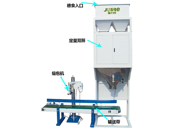 設(shè)定包裝范圍后,物料由給料機(jī)構(gòu)加入稱量斗,控制器收到傳感器的重量信號后,按預(yù)先設(shè)定的程序值進(jìn)行控制,開啟加料門進(jìn)行給料;當(dāng)達(dá)到設(shè)定的范圍,給料機(jī)構(gòu)停止給料,開始另一個秤體的給料。自動振袋后,觸動行程開關(guān),物料袋自動松開落入輸送帶上,被送到縫包機(jī)完成縫包。