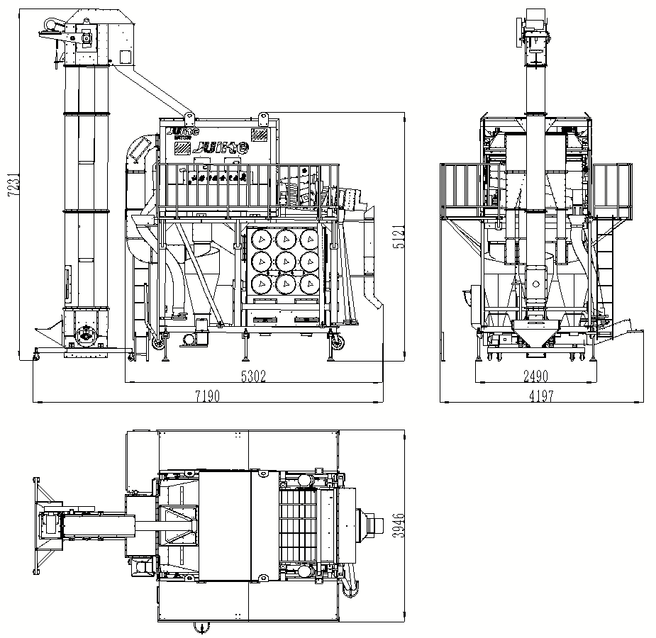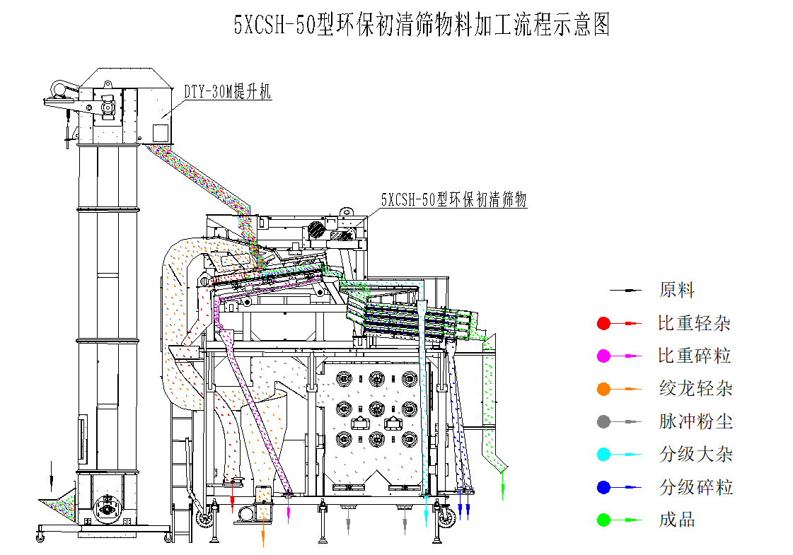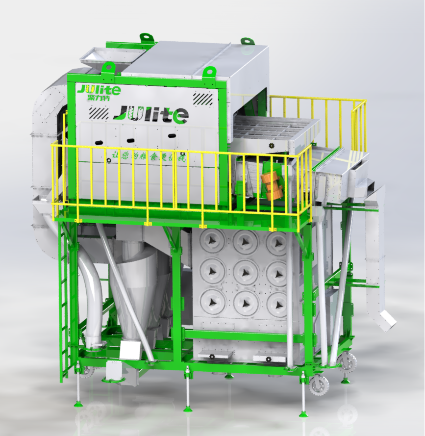 5XCSH-50環(huán)保初清篩主要由上下兩部分結(jié)構(gòu)組成,其中上部分功能為臥式比重風(fēng)選、分級,下部分功能為二級除塵;物料首先經(jīng)喂入斗進(jìn)入臥式風(fēng)選比重臺,通過臥式比重風(fēng)選分離去除物料中的粉塵、糠殼、碎秸稈、玉米軸芯等輕雜,其中含塵氣體經(jīng)旋風(fēng)除塵器完成一級除塵,去除粉塵、糠殼等輕雜,經(jīng)過一級除塵的細(xì)小粉塵空氣進(jìn)入脈沖除塵器完成二級除塵,去除更細(xì)小的粉塵,達(dá)到合規(guī)潔凈排放。臥式比重風(fēng)選分離后的物料進(jìn)入一層大雜篩去除大雜,然后并行進(jìn)入四層小雜篩去除小雜,排出成品。