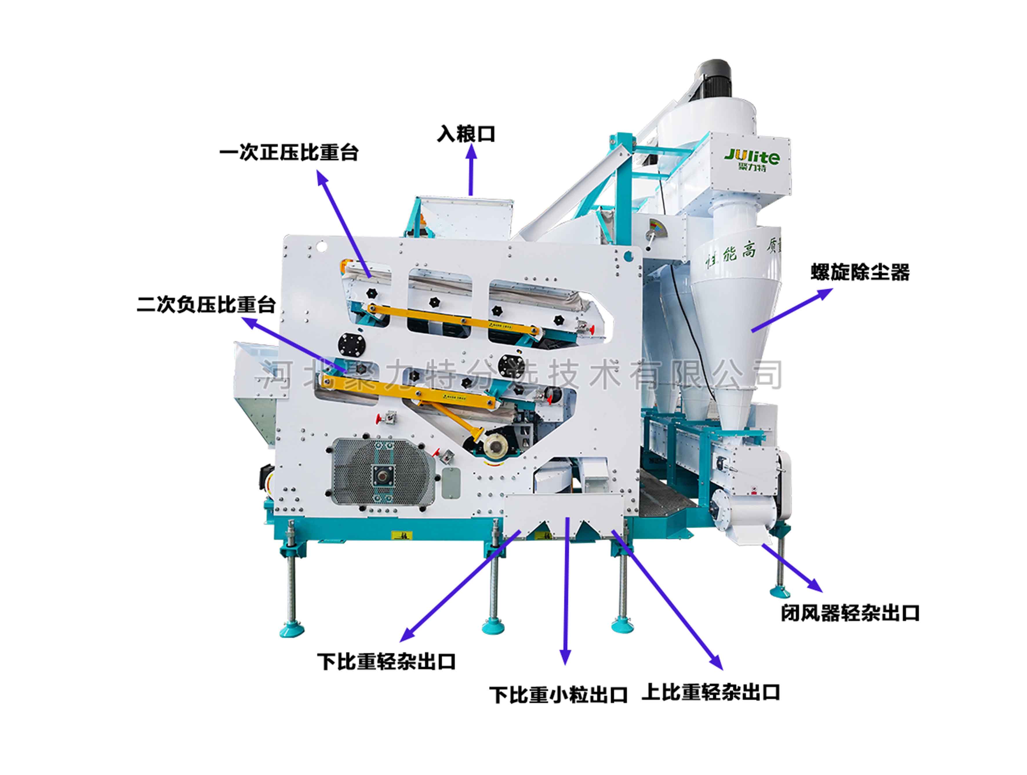 物料通過提升機(jī)經(jīng)喂入斗進(jìn)入第一道負(fù)壓比重臺(tái),通過風(fēng)選去除物料中的粉塵、糠殼等輕雜質(zhì),輕雜經(jīng)風(fēng)道、旋風(fēng)除塵器,由閉風(fēng)器排出;通過比重選有效去除物料中的秸稈、軸芯等比重較輕的雜質(zhì)。然后物料通過導(dǎo)糧機(jī)構(gòu)進(jìn)入第二道正壓比重臺(tái),通過調(diào)整風(fēng)量、擋板位置等進(jìn)行比重加工,去除物料中的碎粒、秕籽、芽粒、蟲蛀粒、霉變粒等雜質(zhì)。最終成品從比重臺(tái)高處排出。